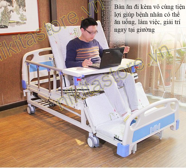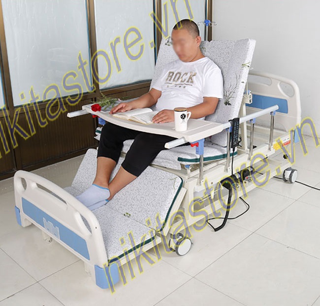 9: Chức năng bàn ăn ngồi ăn uống thư giản trên giường: DH-04 kết hợp chức năng nâng đầu và hạ chân để cho bệnh nhân ngồi giống một chiếc ghế thông thường. bàn ăn gác lên để đồ ăn, sách báo, điều khiển tivi vvv