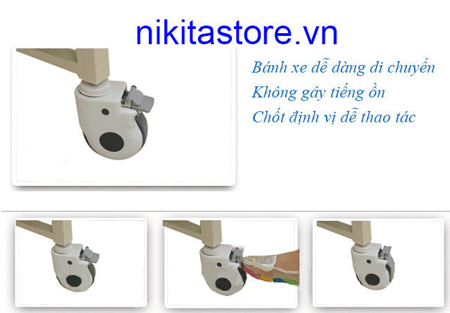 14- Bánh Xe giường bệnh được làm bằng nhựa ABS lõi thép, có khả năng xoay tròng 360 độ, thuận tiện khi di chuyển, trên bánh xe có hệ thống khóa bánh khi cố định 1 chỗ.