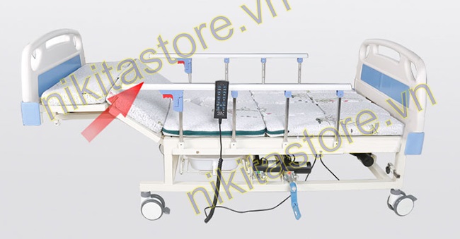 5- Chức năng hạ chân: Giường bệnh nhân NIKITA DH-04 có khả năng hạ chân từ 0-60 độ. tạo cảm giác thoải mái cho bệnh nhân, người già khi nằm cũng như ngồi.