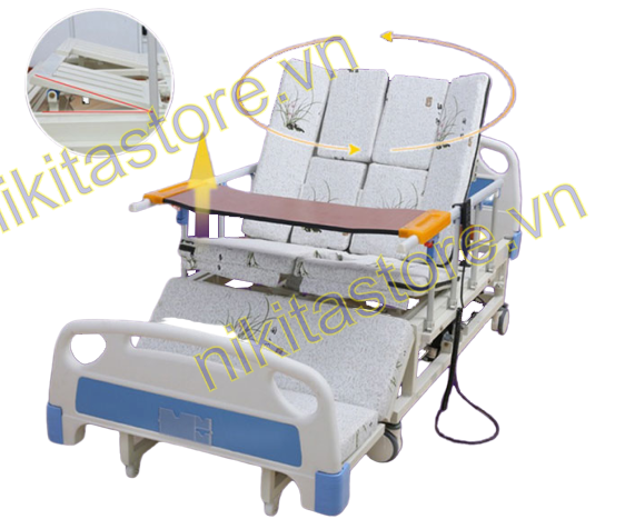 8 Chức năng vệ sinh: Giường có thể dùng cho bện nhân tiểu tiện đại tiện tại chổ, chỉ cần ấn nút Remote thì miếng đệm ở phần mông sẽ hạ xuống đồng thời bô được đẩy vào lỗ vệ sinh. Khi bệnh nhân vệ sinh xong thì mình chỉ cần ấn nút điều khiển thì bô sẽ được đẩy ra đồng thời miếng đệm được để về vị trí cũ.