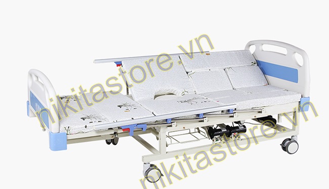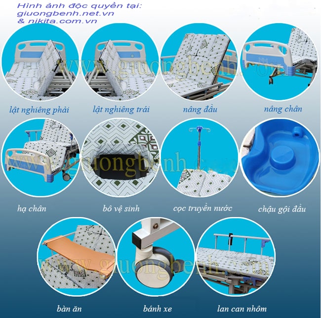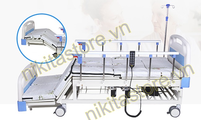- Giường NIKITA DCN10 (NKT-DH03) bao gồm 10 chức năng chính: 1. nâng đầu từ 0° - 80°, 2. hạ đầu từ 80°- 0°, 3. nâng chân đến 45°, 4. hạ chân đến góc 90°, 5. lật nghiêng người sang trái 0° - 85°, 6. lật nghiêng người sang phải từ 0° - 85°, 7. cây truyền dịch, 8. gội đầu, ngâm chân, đi đại, tiểu tiện ngay tại giường ,9. khi mất điện có thể chuyển sang chế độ tay quay để sử dụng, 10. Có chức năng ôm lưng khi ngồi lên để ăn uống hoặc giải trí.