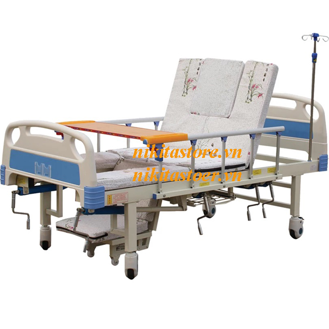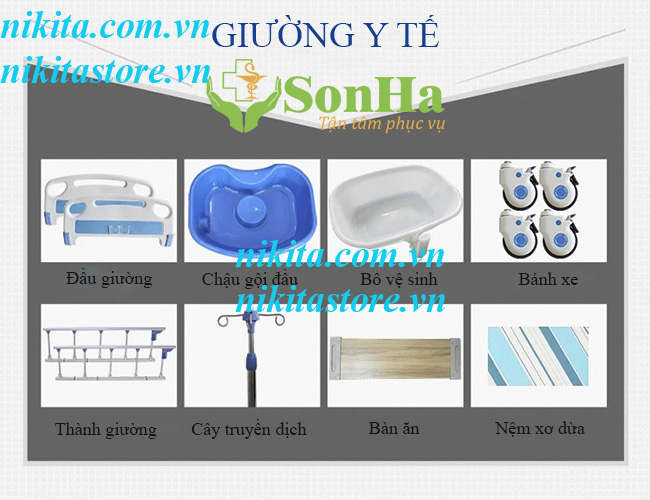- Giường bênh Nikita DCN-05 bao gồm 8 chức năng như: nâng đầu từ 0° - 80° hạ đầu từ 80°- 0° nâng chân đến 45°, hạ chân đến góc 90°, lật nghiêng người sang trái 0° - 85°, lật nghiêng người sang phải từ 0° - 85°, cây truyền dịch, gội đầu, ngâm chân, đi đại, tiểu tiện ngay tại giường.