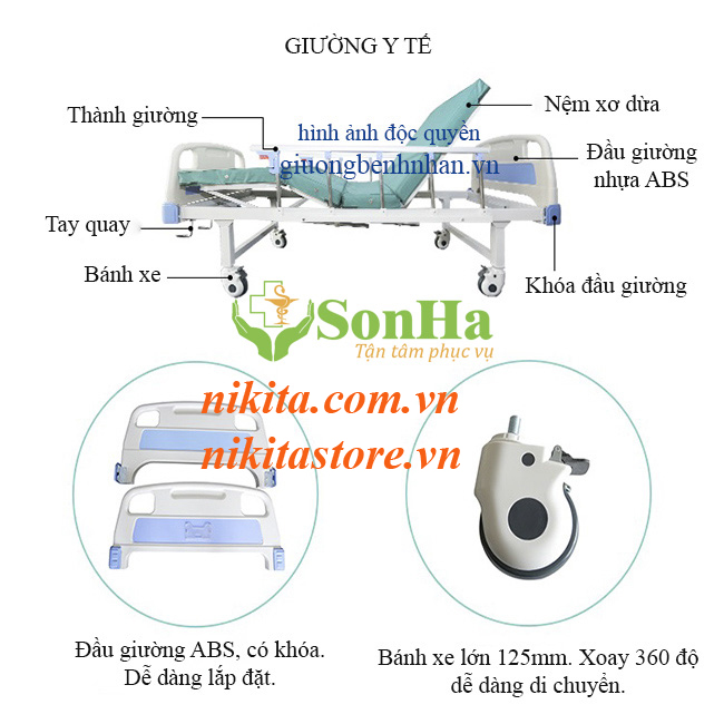 - Chức năng nâng đầu, giường y tế Nikita 5 tay quay có thể nâng đấu lên một cách nhẹ nhàng linh hoạt, chúng ta có thể quay tay nâng đầu từ 0-85 độ, và có thể dừng ở góc độ nào tuy theo nhu càu của mỗi người gia, người bệnh nhân.